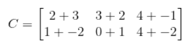 이때 행렬 A와 행렬 B를 더한 행렬을 C 라고 하면 다음과 같이 계산됩니다.