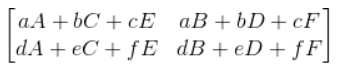곱셈은 다음과 같이 이루어지는데요. 파란선을 기준으로 a, b, c와 A, C, E를 각각 곱해서 더하여 (1,1) 의 원소가 됩니다. 또 노란선을 기준으로 a, b, c와 B, D, F를 각각 곱해서 (1, 2)의 원소가 됩니다. 이런식으로 각 색깔별로 차례로 곱해서 행렬을 완성합니다. 실제 결과는 아래와 같습니다.