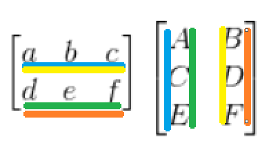 행렬의 곱셈의 경우 행렬이 서로 붙는 부분이 있는데요. 이 붙는 부분의 크기가 같을때 곱셈을 할 수 있습니다. 예를 들어 2 by 3 행렬은 각각 아래와 같이 생겼는데요.