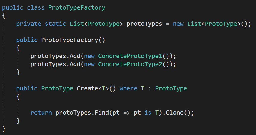 프로토 타입 패턴을 이용하기 위해서는 Prototype이 되는 추상 클래스가 필요합니다. 그리고 해당 클래스에서는 Clone이라는 메서드를 추상으로 선언하게 됩니다. 그리고 나머지 파생 클래스에서는 Clone 함수를 구현하게 됩니다. 그리고 실제 객체가 필요한 경우 PrototypeFactory를 이용해 필요한 객체를 만들 수 있습니다. 객체를 구분하는데 여러가지 방법이 있습니다. enum을 사용하거나, 객체별 id를 부여하거나, type를 비교할 수도 있습니다. 이렇게 객체의 타입을 구분할 수 있는 방법을 하나 선정하여서 이미 프로토 타입으로 인스턴스화된 객체로부터 새로운 객체를 가져오게 됩니다. 여기서 C#을 기준으로 예제 코드가 만들어지는데요. MemberwiseClone 이라는 함수를 사용하게 되는데요. 해당 함수는 객체를 복사한 새로운 객체를 object 타입으로 반환해주는 함수입니다.