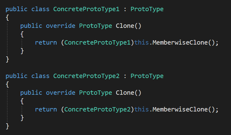 가장 기본이 되는 ProtoType 클래스입니다. 해당 클래스는 추상으로 되어있고, 여기에 id나 다른 변수와 메서드를 추가할 수 있습니다. 그리고 이 추상 클래스를 상속 받아 ConcreteProtoType1, 2, 3 .... 여러가지 파생 클래스를 생성할 수 있습니다. 현재는 생성된 클래스에 모두 Clone 함수를 재정의 해줘야합니다.