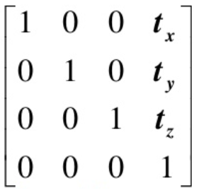이동행렬의 기본은 2차원 직교좌표계와 같이 점을 기준으로 움직인다고 생각하면 됩니다. 3차원 공간이기 때문에 점은 X축, Y축, Z축 이렇게 3가지 방향으로 움직일 수 있습니다. 이때 움직이는 방향의 값을 각각 Tx, Ty, Tz 라고 하면 점 (0, 0, 0)은 (Tx, Ty, Tz)로 이동하게 됩니다. 이를 행렬로 표현할 수 있습니다. 이때 사용하는 행렬은 4 by 4 행렬이고 이는 열과 행이 4개의 원소로 되어있습니다. 그리고 곱하는 점은 (x, y, z, 1) 인 벡터로 표현하게 됩니다.